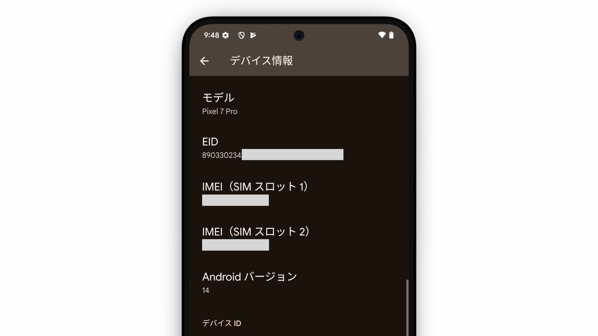 Android端末の場合は「設定」>「デバイス情報」と進み、画面を下にスクロールしていくと、EID が表示されます。
