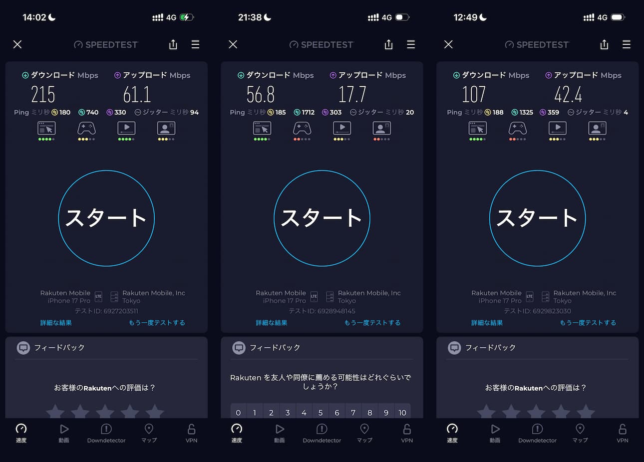 以下はスピードテストの結果で、場所は左からホーチミン市内、タンソンニャット空港内、そしてニャチャン市内です。
