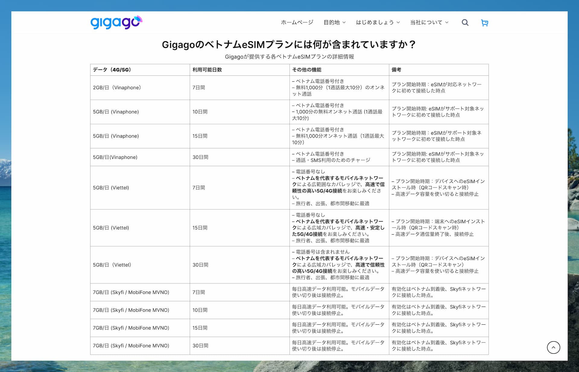 尚、ベトナムeSIMのページをスクロールすると以下のようにプランの比較表があり、内容を細かく確認できます。(一部購入できないプランも含まれているかもしれません。)