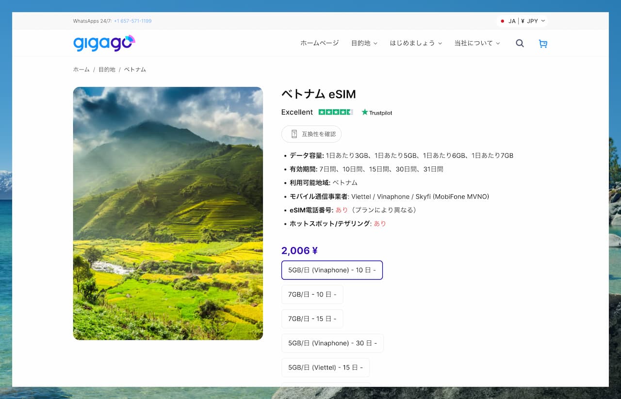 GIGAGOはベトナムの通信会社VinaPhone、そしてViettelが提供するローカルeSIM(現地eSIM)を販売していること、そしてベトナムの電話番号 & SMS付きのプランがあるのが最大の魅力。