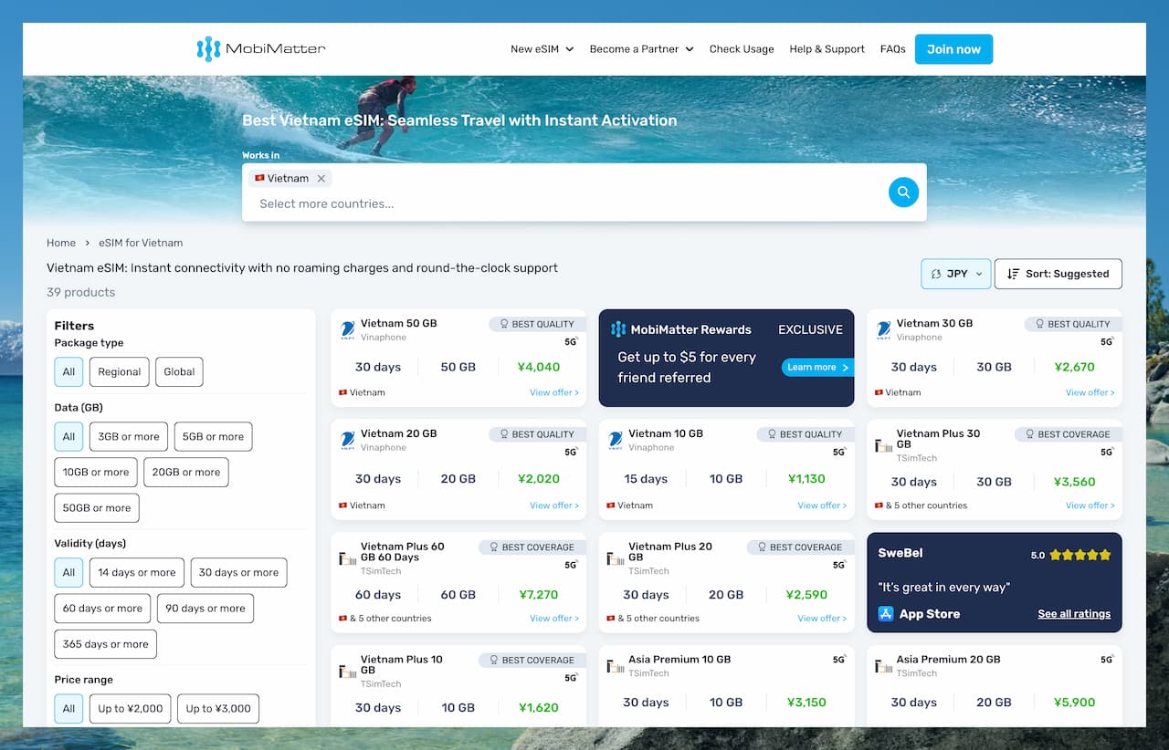 MobiMatter公式サイトのベトナムeSIMページでは、大量のeSIM商品が掲載されていますが、"BEST QUALITY"とラベルがついている、Vietnam XXGBというプランはどれもコスパが良いです。5Gにも対応。