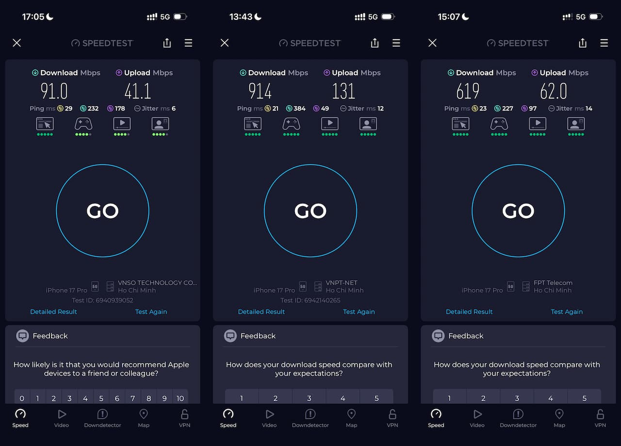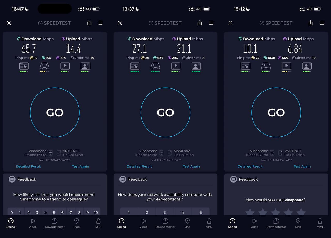 以下がホーチミンでのスピードテストの結果です。左から、タンソンニャット国際空港、レタントン通り周辺、そして独立宮殿周辺。