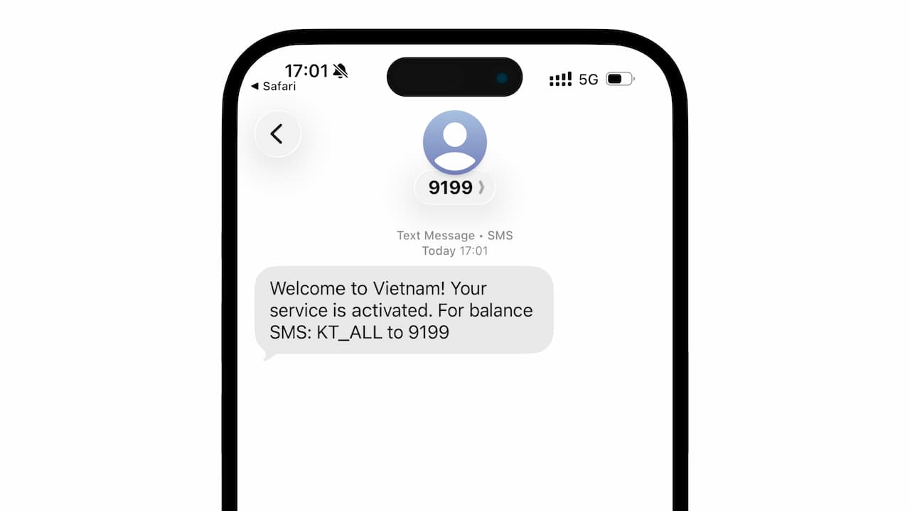 すぐに、VinaPhoneからウェルカムメッセージがSMSで届きます。現地eSIMならではですね。
