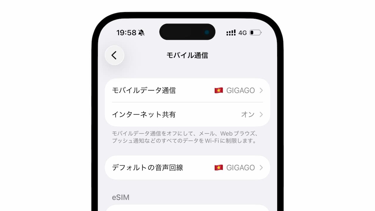 (ローミングeSIMだとデータローミングをオンにする必要がありますが、)ローカルeSIMなので、データローミングの設定はオフのままでOK。